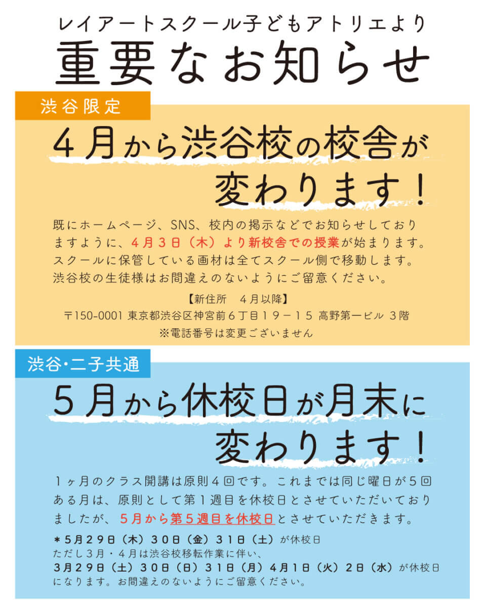 いつもレイアートスクールをご利用いただき、ありがとうございます。子どもアトリエより渋谷校移転と休校日に関するお知らせがございます。