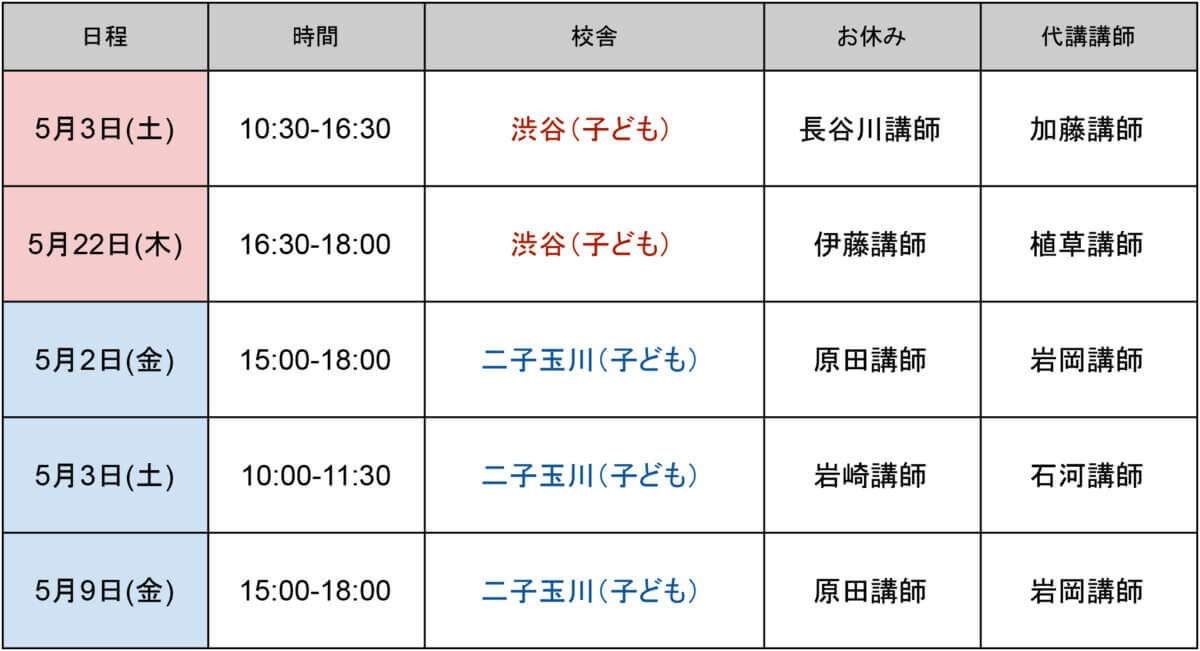 5月代講のお知らせ