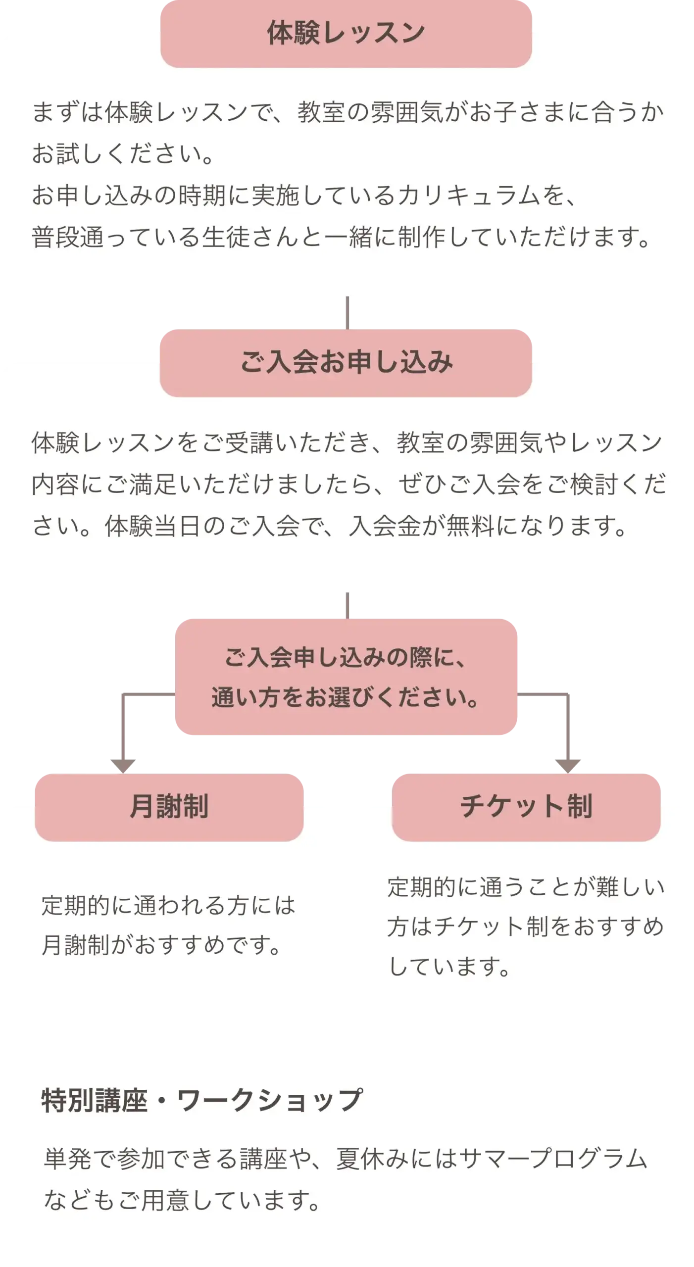 ご利用料金についてご案内いたします。月謝制とチケット制がございます。