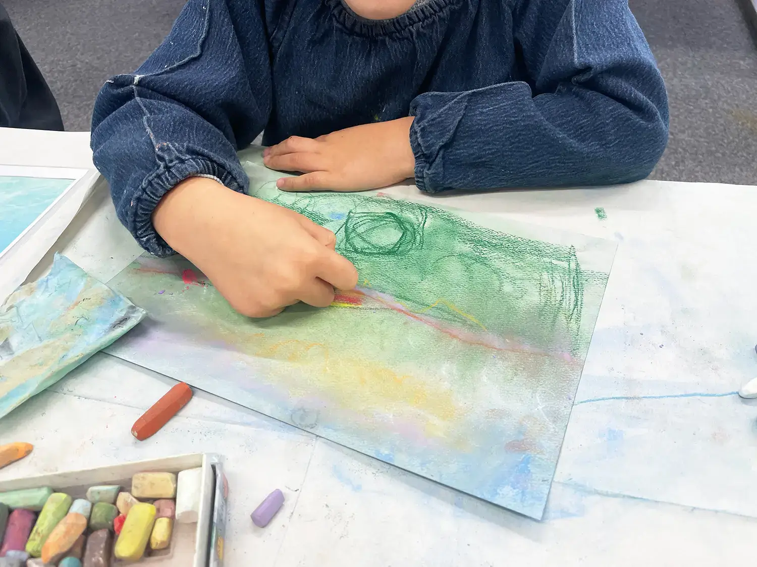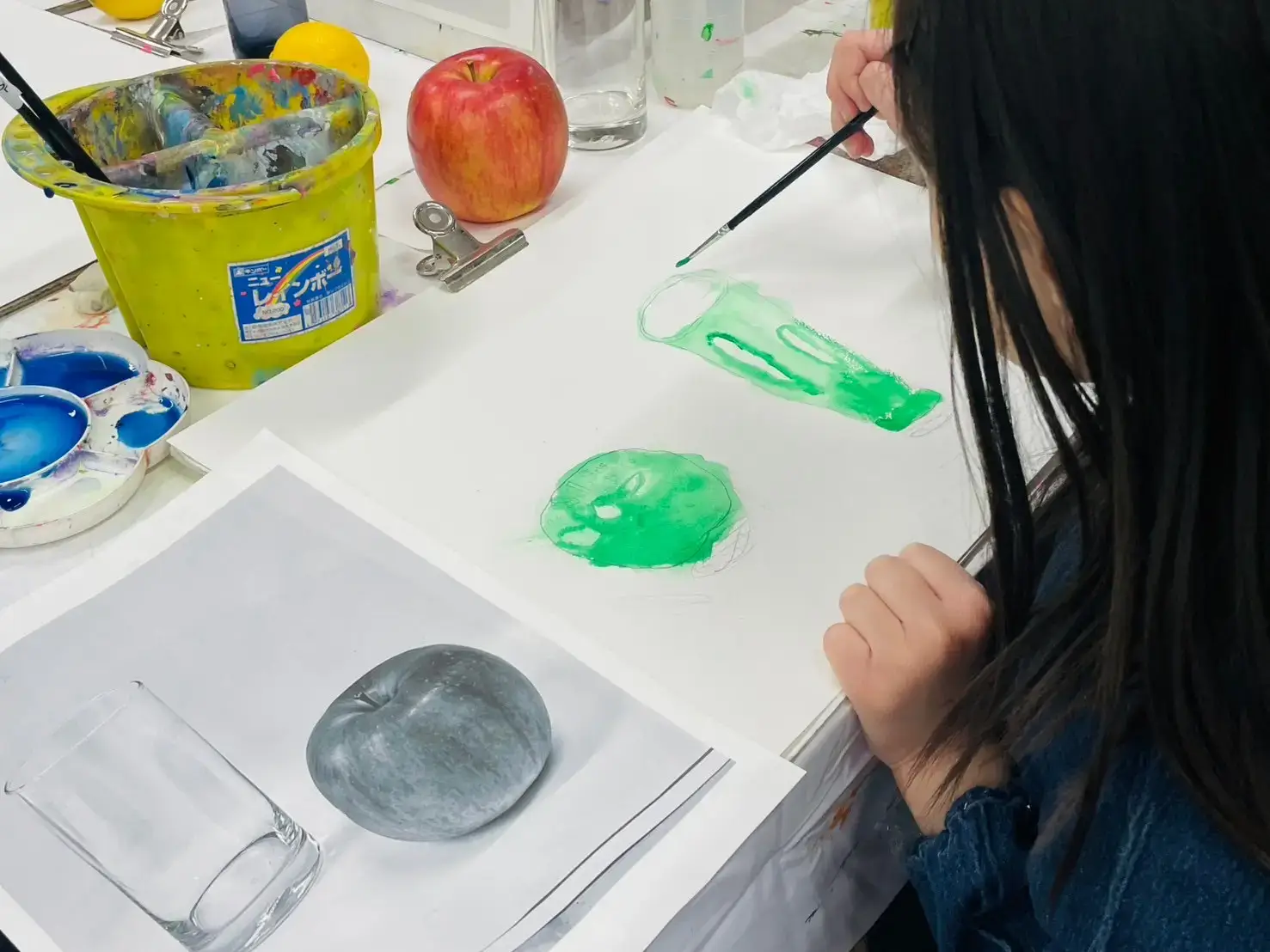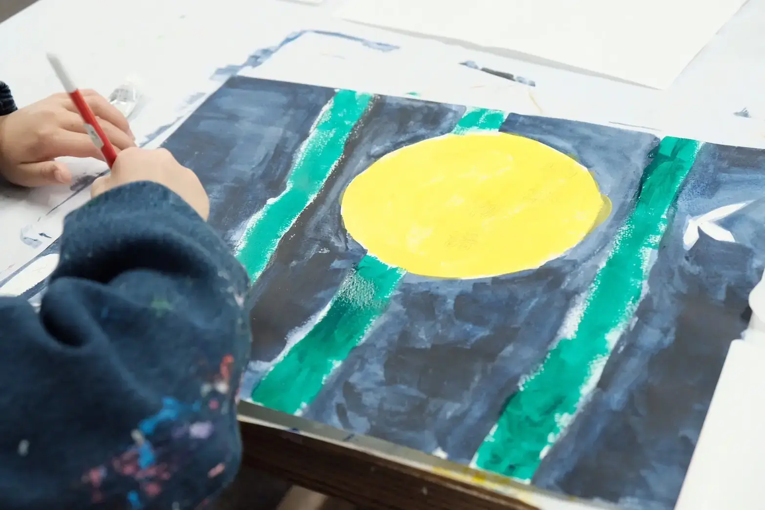 教室では、一人ひとりの感じ方や興味を大切にしながら、好きなテーマや色、表現方法を自由に選んで制作しています。思いきり筆を動かす子、じっくり観察して描く子など、その表現は本当にさまざま。毎回、子どもたちの“今しかないひらめき”から、素敵な絵が生まれています。