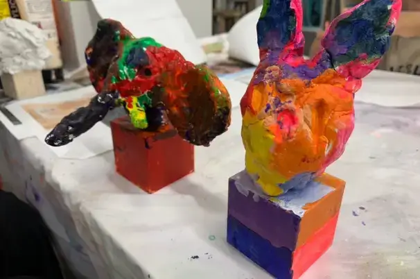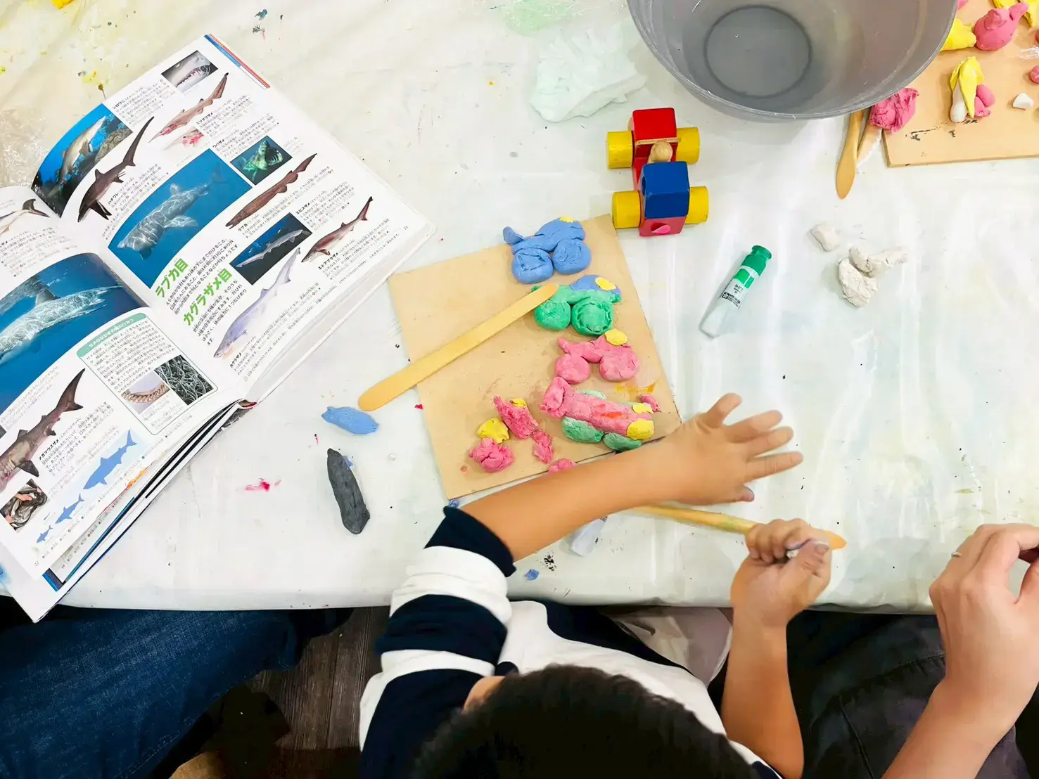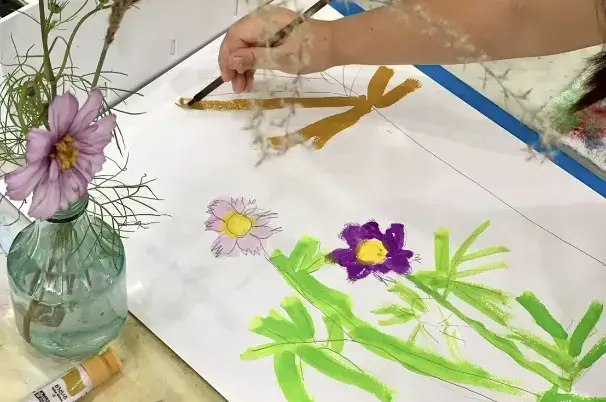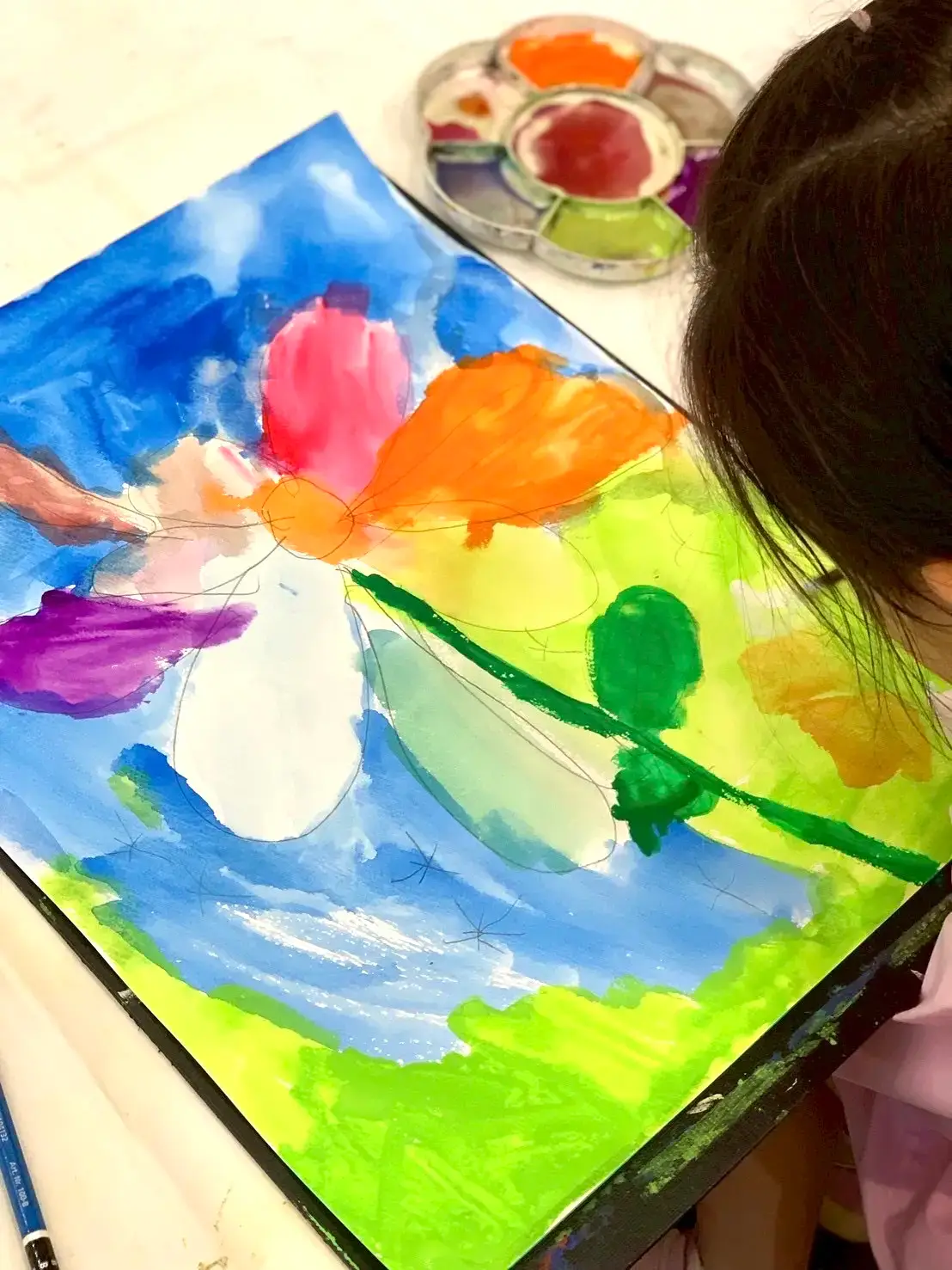 教室では、一人ひとりの感じ方や興味を大切にしながら、好きなテーマや色、表現方法を自由に選んで制作しています。思いきり筆を動かす子、じっくり観察して描く子など、その表現は本当にさまざま。毎回、子どもたちの“今しかないひらめき”から、素敵な絵が生まれています。